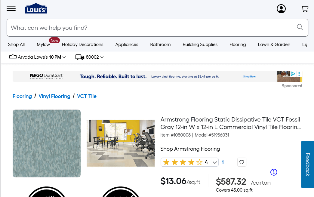 Let's Check the Price from Lowes! Data collected on 10/10/2025: Armstrong Exelon SDT from Lowes, $13.06 PSF! These tiles require Armstrong ESD Floor Finish at $100 a gallon! *************************************