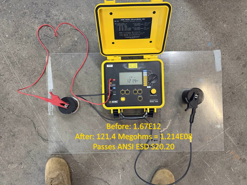 ElectraThane controls static buildup by microscopically altering the texture of the smooth epoxy while adding a hygroscopic layer that increases electrical conductivity. This combination helps to harmlessly migrate the static to electrical ground. The results are stunning, often reducing the static voltage from a whopping 6.5kV to a mere 250 volts (well below the threshold of human perception).
